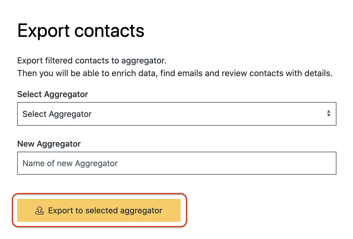 Click the Export button on a Scrupp group page and select the existing aggregator or create a new one.