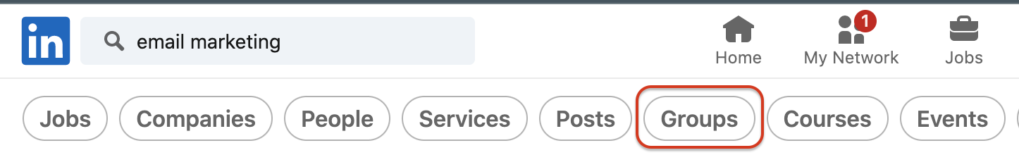 Type a request in the main Linkedin search inbox and click to the Group tab to switch search results.