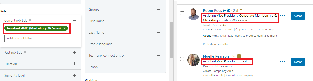 For example, Assistant AND (Marketing OR Sales). This will look for profile containing: